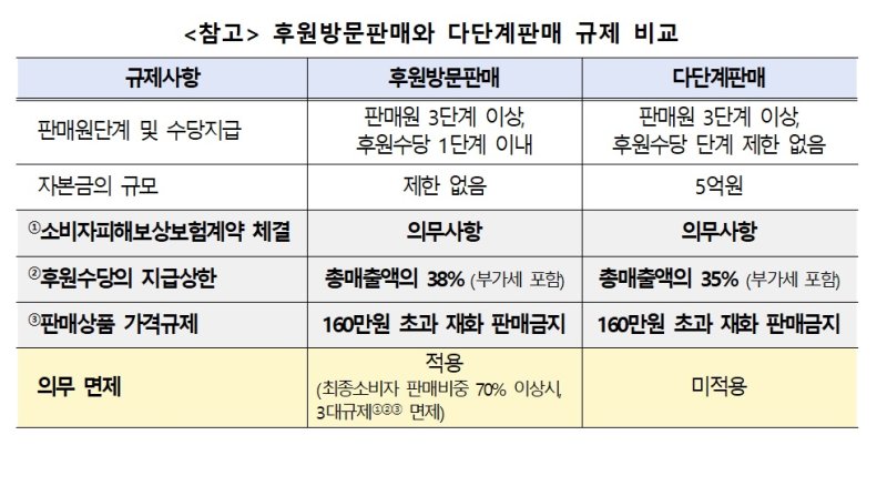 공정위는 "후원수당 재원은 결국 소비자나 판매원에게서 나오기에 과도한 후원수당 지급은 품질이 낮은 제품을 비싼 가격에 판매할 강력한 유인이 된다"며 "그로 인한 사행성 조장과 소비자 피해 증가가 우려되기에 방문판매법은 후원수당 지급기준 등을 강력 규제한다"고 말했다.