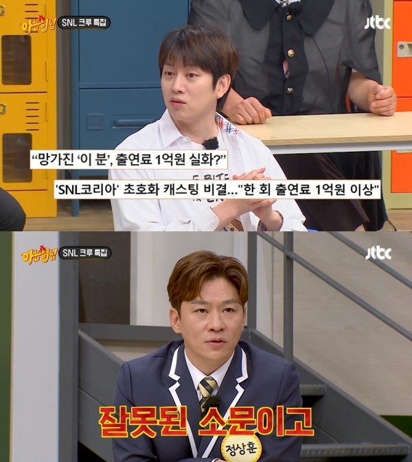 지난 4일 방송된 JTBC 예능물 '아는 형님'에서 SNL 크루 정상훈, 김민교, 정이랑, 권혁수, 이수지, 주현영, 김아영이 등장했다. 그동안 SNL 호스트에 배우 조진웅, 고수, 조정석 등 스타들이 출연한 것을 두고 김희철인 "돈이 많은 건가, MC 신동엽의 인성 덕분에 섭외가 잘 된 건가? (출연료가) 1, 2억이란 이야기도 있다"라고 궁금해했다.