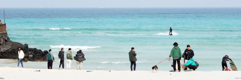 제주하면 가장 먼저 떠오르는 바다에도 완연한 봄 풍경이 펼쳐졌다. 이날 오후 제주시 조천읍 함덕해수욕장을 찾은 관광객들은 두터운 외투를 벗어들고 가벼운 옷차림으로 산책에 나섰다.