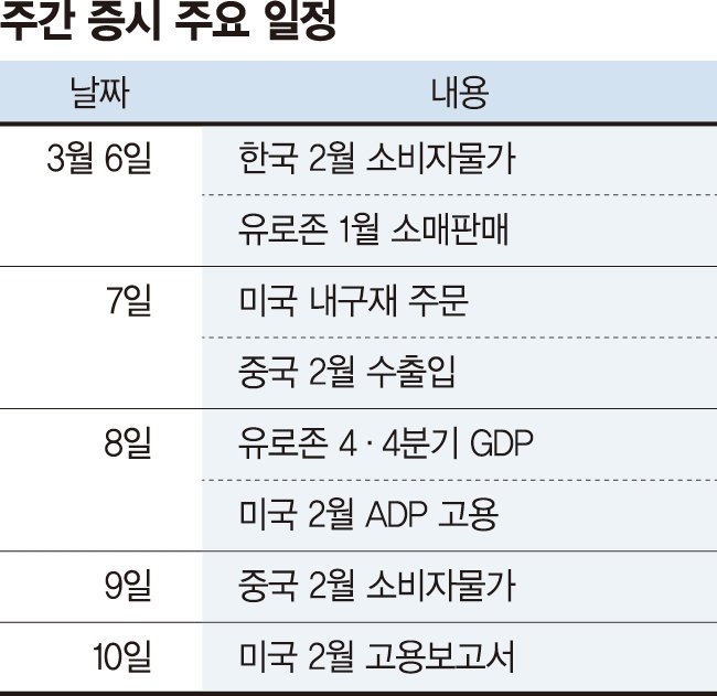 이번 주 관전 포인트가 될 미국 주요 경제지표는 2월 내구재 주문, 오토매틱데이터프로세싱(ADP) 고용, 고용보고서 등이다. 오는 14일에는 금융시장의 주목도가 가장 높은 2월 소비자물가가 나온다.