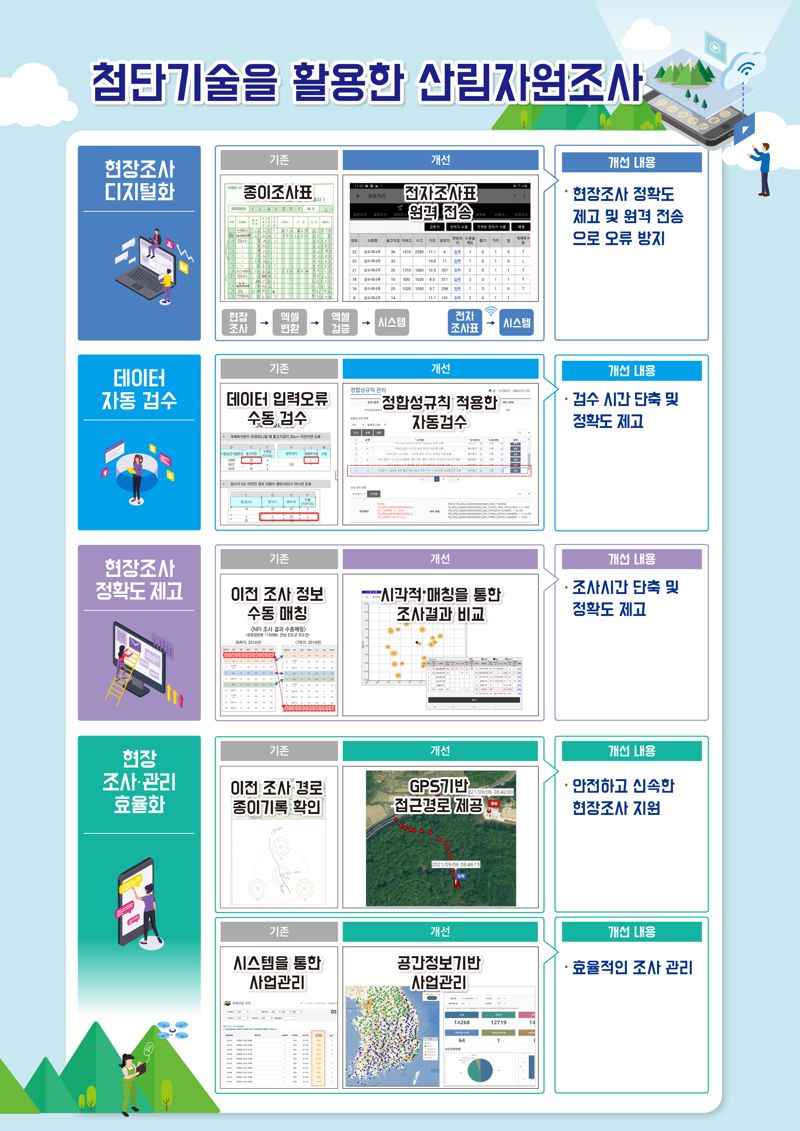 산림청은 이러한 문제점을 해결하기 위해 전자조사표 어플을 새로 개발하고 통계관리시스템을 개선했으며, 현장 시범운영을 거쳐 올해 산림자원조사에 전면 도입했다.