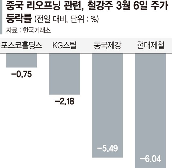 6일 한국거래소에 따르면 이날 코스피지수는 1.26% 상승 마감했으나 대표적 중국 리오프닝주로 꼽히는 철강주는 대거 하락세를 보였다. 현대제철과 동국제강 주가는 전 거래일 대비 각각 6.04%, 5.49% 떨어졌다.