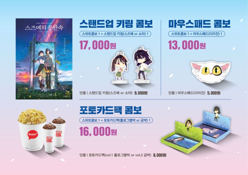 8일부터 단독 굿즈로 △주인공 스즈메·소타 캐릭터가 그려진 스탠드업 키링 △고양이 다이진 얼굴이 새겨진 마우스패드 △영화 포토카드팩 홀로그램·금박 버전을 선보인다.