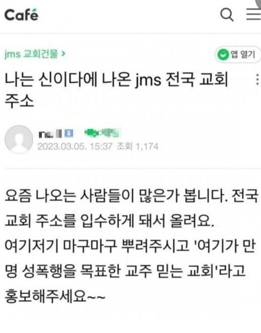 지난 5일 JMS 피해자 커뮤니티에 ‘나는 신이다에 나온 JMS 전국 교회 주소'라는 제목의 게시물이 업로드된 이후 8일 오후 현재 30여 개가 더해져 120여 곳으로 늘어났다.