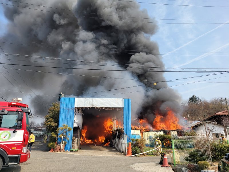 이 불로 창고건물 2동과 주택 1동, 내부집기가 타 소방서 추산 1억원의 재산피해가 발생했다.