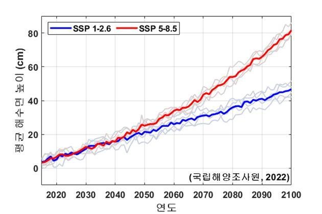 해양조사원은 서울대학교 조양기 교수팀과 공동으로 우리나라 주변 고해상도(수평 약 6km) 해양기후 수치예측모델에 SSP 시나리오를 적용해 우리나라 주변 해역의 평균해수면 상승 폭을 분석했다. 그 결과, 온실가스가 저감 없이 배출되는 고탄소 시나리오(SSP 5-8.5)에서 해수면 높이는 2050년까지 25cm, 2100년에는 82cm까지 상승할 것으로 전망됐다.