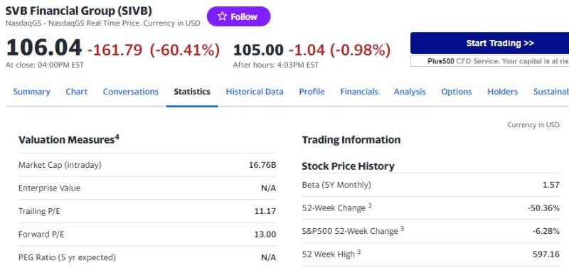 9일(현지시간) 뉴욕증시에서 SVB 파이낸셜은 17억5000만 달러의 주식 매각을 발표한 후 주가가 전거래일보다 60.41% 폭락한 106.04 달러를 기록했다. 이 은행은 장중 여러 차례 거래가 중지됐었다.