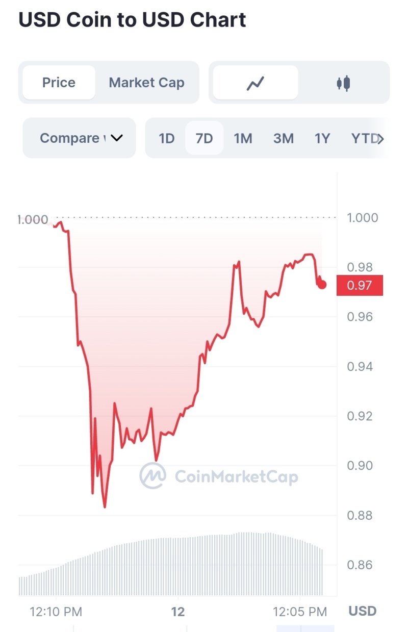 이 준비금 중 일부가 SVB에 묶여 보호받지 못할 가능성이 제기되면서 USDC의 고정 가격이 무너지는 '디페깅' 현상이 발생했다. 0.87달러까지 떨어졌던 가격은 현재 0.97달러까지 회복된 상태이나, 여전히 1달러 페깅에는 도달하지 못했다.