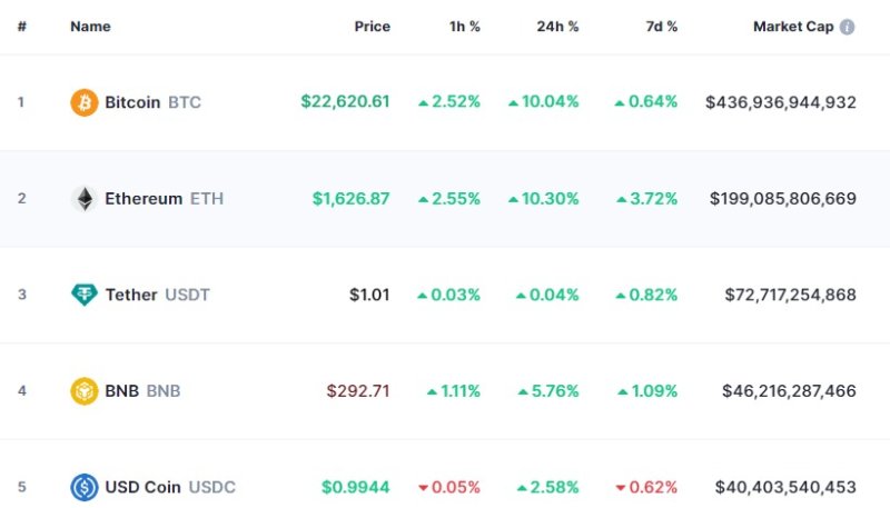 13일 오전 9시 40분 현재(한국시간 기준) 비트코인은 글로벌 코인시황 중계사이트인 코인마켓캡에서 24시간 전보다 10.04% 폭등한 2만2620 달러를 기록하고 있다.
