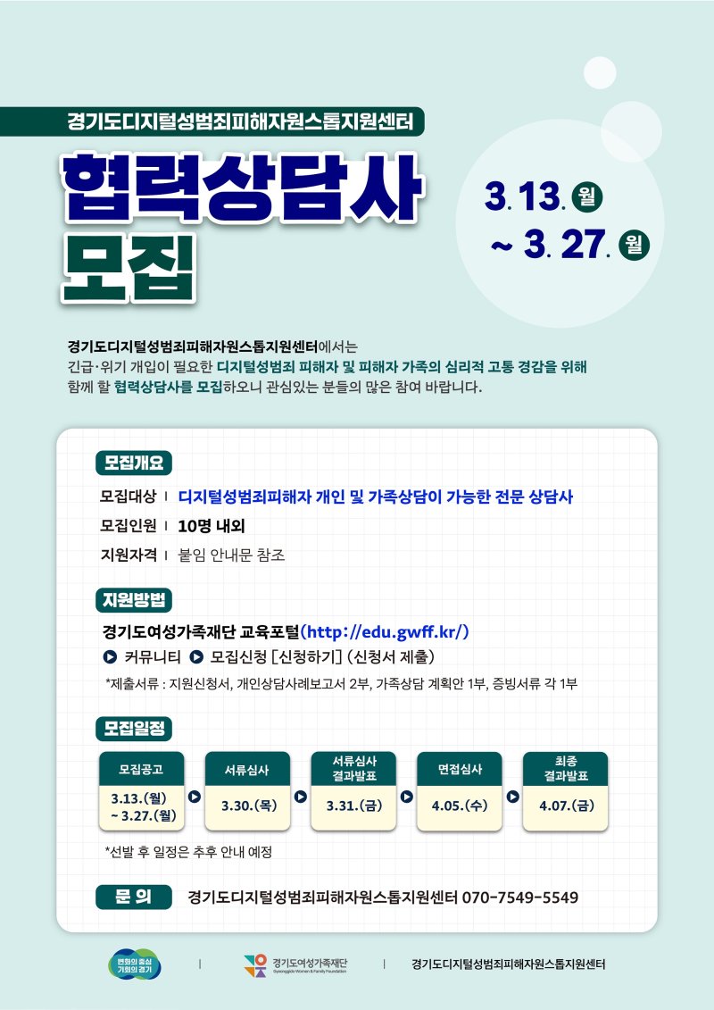 전문상담사 모집 신청은 27일까지 경기도여성가족재단 교육포털(http://edu.gwff.kr/)에서 할 수 있고, 다음 달 7일 최종 선정 결과를 발표한다.
