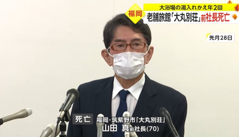 13일 요미우리신문 등 현지 언론은 이날 후쿠오카현 158년 전통의 고급 료칸 '다이마루별장'의 전 사장 야마다 마코토(70)가 사망했다고 보도했다.
