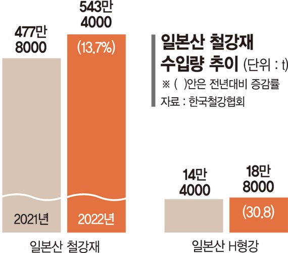 일본산 철강재 중 수입 증가가 눈에 띄는 제품은 건설현장에 쓰이는 H형강과 철근이다. 작년 일본산 H형강은 전년 대비 30.8%가 늘어난 18만8000t이 수입됐다. 철근의 경우 37만9000t이 일본에서 유입됐는데 전년과 비교해 5.0% 소폭 줄었지만 2년 전과 비교하면 2배 넘는 물량이 들어왔다.