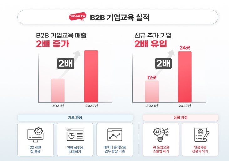 ▲에듀테크 스타트업 팀스파르타는 '스파르타코딩클럽'의 지난해 B2B(기업간거래) 사업 매출이 1년만에 100% 성장했다고 공개했다. 팀스파르타를 통해 코딩 교육을 진행한 기업고객은 총 39곳이다. 지난해에는 전년대비 기업수가 2배 이상 늘었다. 스파르타코딩클럽은 난이도·직군·교육에 따라 데이터 활용, 마케터 교육, 인공지능·머닝러신·딥러닝 등 다양하고 세분화된 커리큘럼을 확장해 나갈 계획이다.