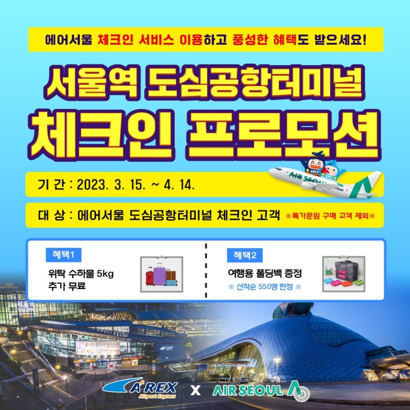 공항철도는 또 에어서울 탑승객 중 550명에게(선착순) 여행용 폴딩백도 증정한다.