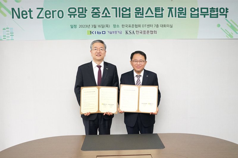 ▲기술보증기금(기보)은 한국표준협회(협회)와 지난 16일 서울 강남구 협회 대회의실에서 '넷제로(Net Zero) 유망 중소기업 원스톱 지원 업무협약'을 체결했다. 협회는 탄소감축 유망 중소기업을 발굴해 기보에 추천하고 탄소감축량을 평가한다. 기보는 탄소감축 효과를 화폐가치로 환산해 탄소가치평가보증을 우대 지원한다. 또 기술이전 중개, 기술사업화 지원, 기술임치와 기술신탁 등 차별화된 금융서비스를 지원할 계획이다. 기보는 탄소 중립 대응력이 부족한 중소기업의 자금애로 해소를 위해 올해 5000억원 이상의 탄소가치평보증을 신규 공급한다.
