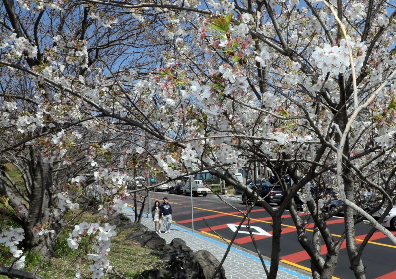 제주시 도두봉, 전농로, 종합경기장 등에 있는 벚나무 거리 역시 만개는 아니지만 드문드문 한두그루에 벚꽃이 피어 봄의 향연을 예고하고 있다. 제주지역에는 다음주쯤에 본격적인 '벚꽃엔딩' 계절의 막이 오를 것으로 보인다.