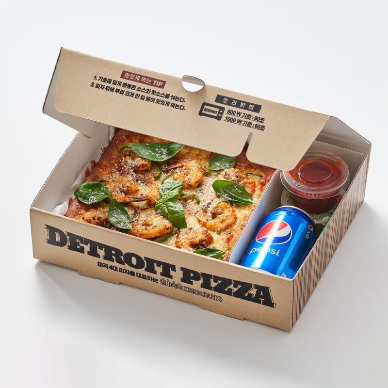 이번 디트로이트 피자는 음료, 피클, 소스가 함께 동봉된 핸드캐리형 패키지로 제작돼 간편하게 운반할 수 있도록 했다.