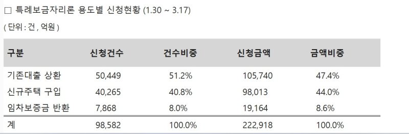 용도별 전체 신청현황을 보면 '기존대출 상환'의 경우 5만449건이 접수돼 전체의 51.2%를 차지했다.