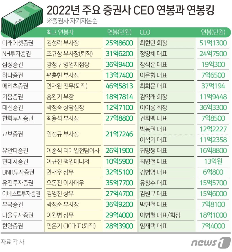 (서울=뉴스1) 손엄지 기자 = 지난해 어려운 시장 상황에서도 수십억원의 연봉을 받은 증권사 '연봉킹'이 쏟아졌다. 특히 기업금융(IB) 업무를 하는 임직원들은 최고경영자(CEO)보다 훨씬 많은 보수를 챙겼다.