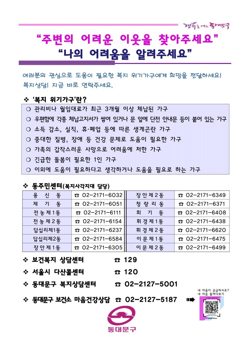 이에 동대문구는 관내 오피스텔 입주민을 대상으로 각 복지상담 기관의 연락처, 복지서비스 내용 등이 담긴 안내문을 배부한다. '마음건강 Q코드'도 동봉, Q코드를 통해 검진한 결과는 동대문전신건강센터로 전송된다.