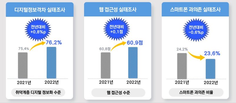과학기술정보통신부는 디지털과 관련된 사회 현황 진단을 위해 디지털정보격차, 접근성, 스마트폰과의존 분야 2022년도 실태조사 결과를 23일 발표했다.