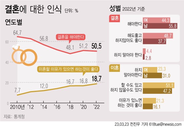 작년 국민 중 결혼을 해야 한다고 생각하는 비중은 50.0%로 2년 전보다 1.2%p 감소했다. 남자(55.8%)가 여자(44.3%)보다 11.5%p 높았다.