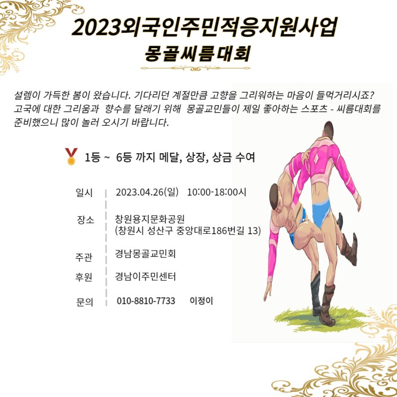 [창원=뉴시스] 홍정명 기자 = 경남몽골교민회 주관 몽골씨름대회와 경남캄보디아교민회 주관 '쫄츠남' 행사가 오는 26일 오전 9시부터 오후 6시까지 창원시 성산구 용지문화공원과 포정사 공원에서 각각 열린다.