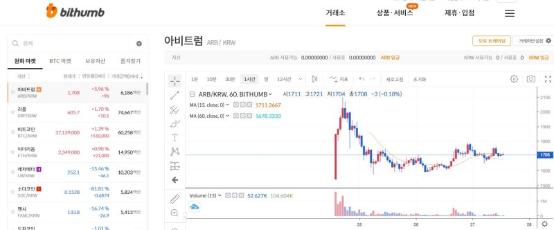 아비트럼을 국내에서 처음으로 상장한 빗썸에 따르면 아비트럼 가격은 27일 오후 1시 45분 기준, 전일 같은 시간 대비 5.96% 오른 1708원을 기록하고 있다. 이날 기준, 빗썸에서 리플, 비트코인, 이더리움, 레저메타에 이어 거래량 5위를 기록하며 빗썸 내에서도 '상장 효과'를 보고 있다.