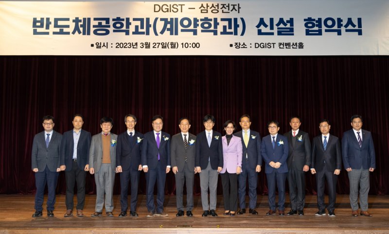 DGIST는 27일 DGIST 대학본부 컨벤션홀에서 삼성전자 남석우·김완표 사장, DGIST 국양 총장 등 주요 관계자가 참석한 가운데 반도체 계약학과 설치 및 운영을 위한 업무 협약을 체결했다.