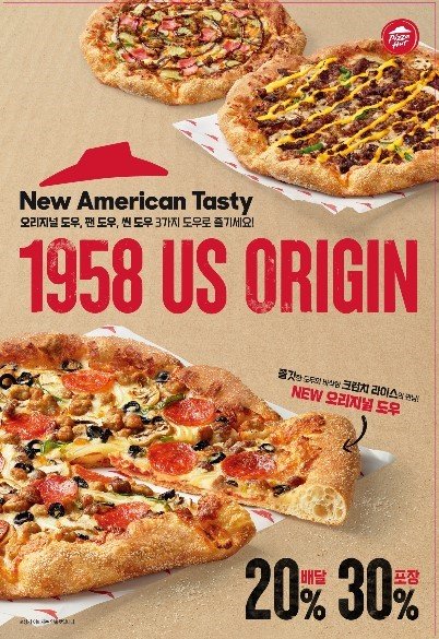 피자헛은 1958 US 오리진 신규 출시를 기념해 배달 주문 고객에게는 최대 20%, 방문 포장 고객에게는 최대 30% 할인 혜택을 제공한다.