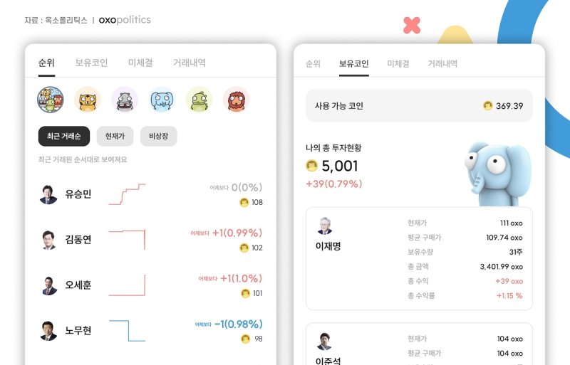옥소 정치인 주식 거래소는 커뮤니티 내에서 활동하면서 획득한 '옥소코인'으로 정치인 주식을 매매하면서 수익을 낼 수 있는 서비스다. 특정 정치인에 대한 본인의 지지의사를 표명하고 투자라는 경제 활동과 연계해 수익도 낼 수 있도록 마련됐다.