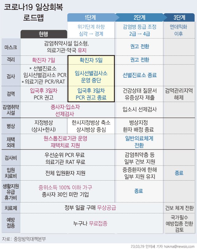 먼저 5월 초쯤 1단계로 코로나19 위기단계를 '심각'에서 '경계'로 하향할 경우 확진자 의무격리 기간을 7일에서 5일로 단축한다. 2단계 조정 시점에는 마스크·격리 의무를 모두 해제하며 선별진료소 운영을 종료해 대부분 일반의료체계로 전환하며, 3단계는 완전히 독감(인플루엔자)처럼 관리하는 수순을 밟게 된다.
