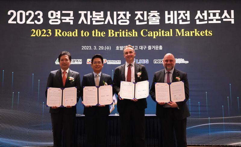 29일 대구테크노파크(이하 대구TP)에 따르며 대구시와 이날 오후 2시 호텔 인터불고 대구에서 '2023 영국 자본시장 진출 비전선포식'을 갖고, 런던 증권거래소(LSE:London Stock Exchange)와 영국 투자 및 상장(IPO) 활성화를 위한 업무협약을 체결한다고 밝혔다.