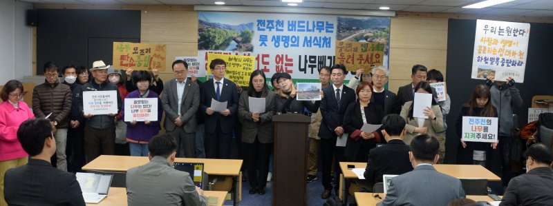 전북환경운동연합과 전주시의원 등은 29일 전주시청에서 기자회견을 열어 "전주천과 삼천 일대에서 홍수 예방 등을 목적으로 무차별적인 버드나무 벌목이 이뤄졌다"면서 "이에 대해 전주시장은 사과해야 한다"고 지적했다.