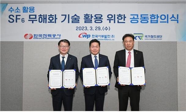 (대전ㆍ충남=뉴스1) 박찬수 기자 = 국가철도공단은 29일 공단 본사에서 엄경일 한국서부발전㈜ 기술안전본부장, 이중호 한국전력공사 전력연구원장 등이 참석한 가운데 전기설비 개폐장치 등에 절연가스로 사용하고 있는 SF6(육불화황)가스를 친환경적으로 처리하기 위해 'SF6 무해화 기술 공동 활용' 업무협약을 체결했다고 30일 밝혔다.