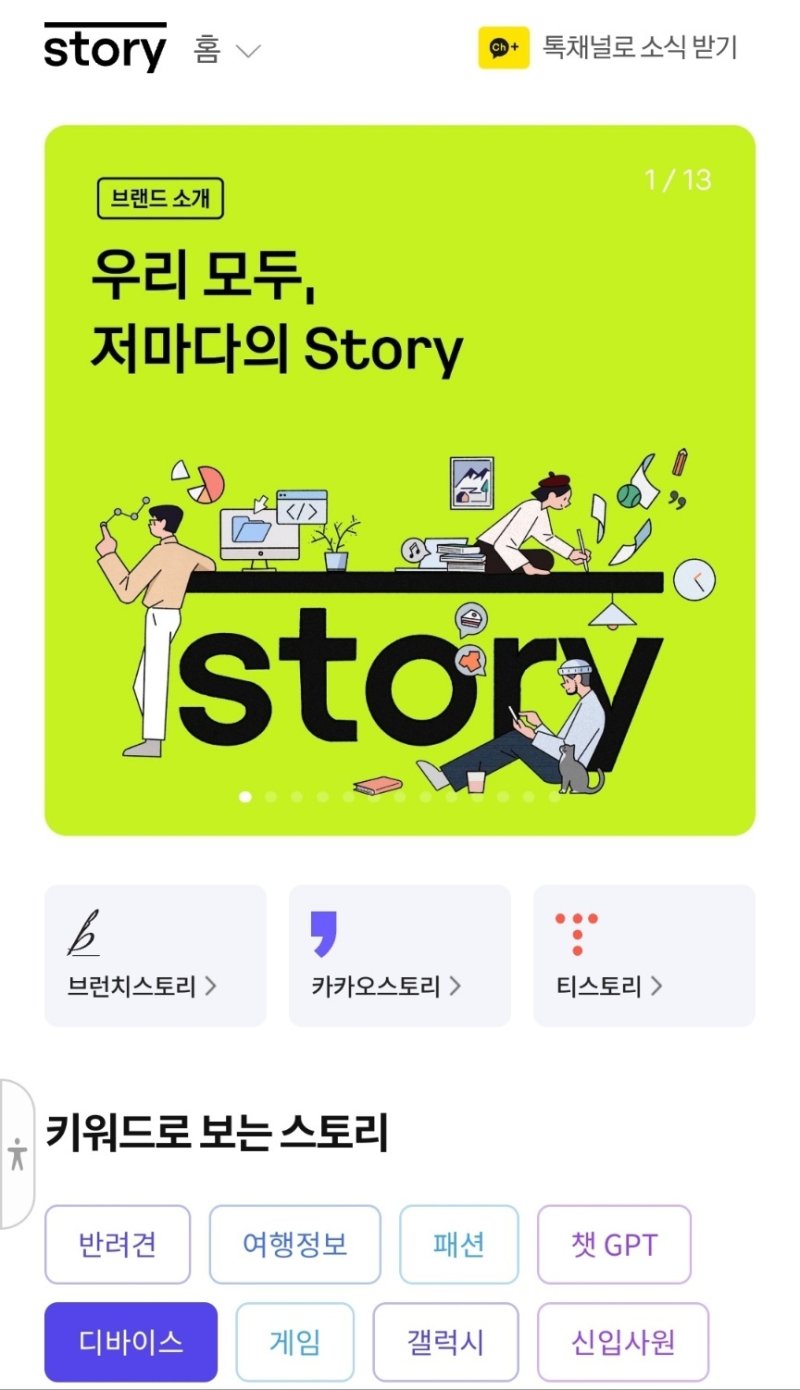 카카오가 '스토리'라는 브랜드 하에 브런치·티스토리·카카오스토리 콘텐츠를 한번에 볼 수 있는 공간을 만든 것이다. '스토리 홈' 홈페이지에 접속하면 각 서비스의 콘텐츠를 한번에 모아 볼 수 있다.