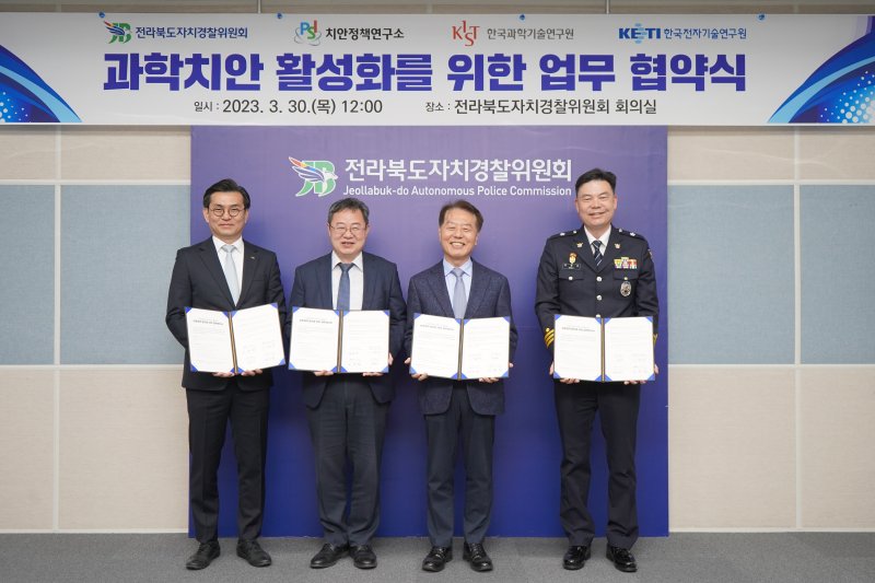 [전주=뉴시스] 김민수 기자 = 전라북도자치경찰위원회(위원장 이형규)는 30일 지역특화 과학치안 활성화를 위해 치안정책연구소, 한국과학기술연구원, 한국전자기술연구원과 업무협약을 체결했다고 밝혔다.