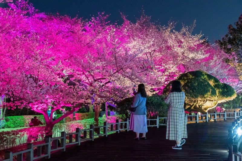 벚나무 주변에 설치된 조명들이 주기적으로 변하는 형형색색의 빛을 내 연분홍 벚꽃과 함께 동화 속 공간에 온 것 같은 몽환적인 분위기를 연출한다.