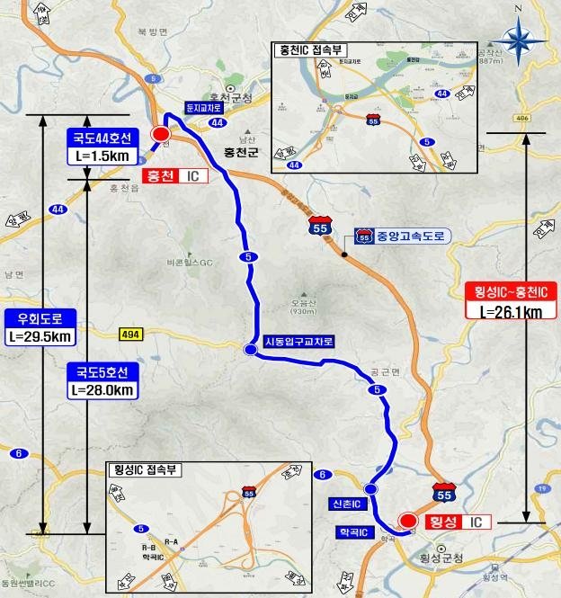 차량 정체 시 우회도로는 국도 5호선과 44호선을 이용하면 된다.