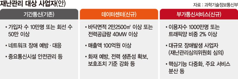 아울러 재난관리 대상 사업자 기준에 미치지 않더라도 서비스 장애가 대규모 발생한 일정 규모 이상 사업자에 대해서도 통신재난관리심의위원회 심의를 거쳐 한시적 관리대상에 지정할 수 있도록 시행령 안을 마련했다. 하루 이용자 수 100만명 이상 또는 트래픽 양 비중 1% 이상인 부가통신사업자 중 지정 가능하다는 점에서 간편결제 서비스 등이 해당될 것으로 보인다.
