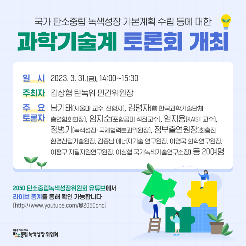 '2050 탄소중립녹색성장위원회'는 기본계획에 대한 과학기술계의 다양한 의견을 수렴하기 위해 온·오프라인 토론회를 개최한다.