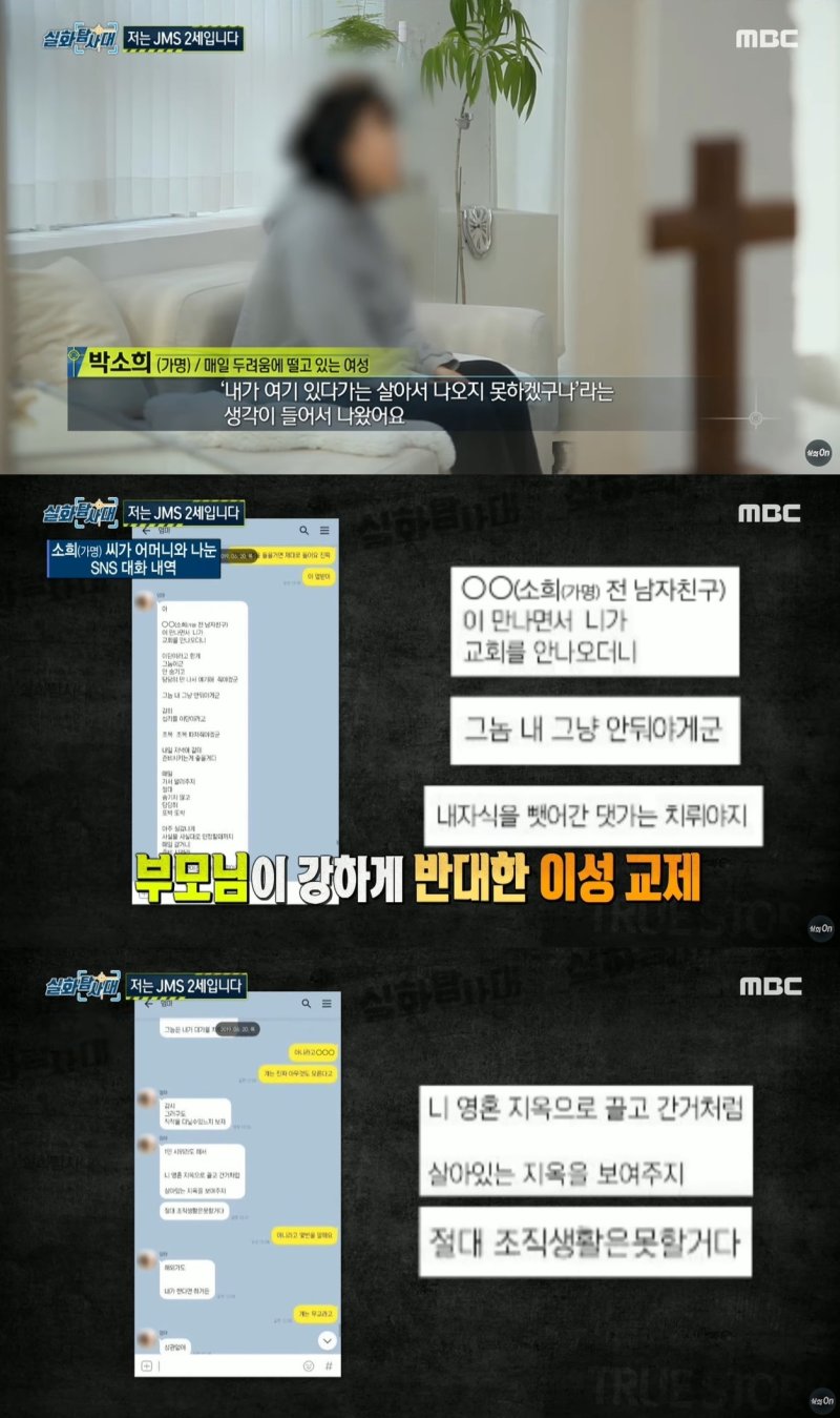 30일 MBC 실화탐사대에서는 JMS 교인 부부 자녀들의 폭로가 그려졌다. 중학생 때부터 '가족의 품을 떠나야겠다'고 다짐했다는 박소희(가명)씨는 "많이 무서웠다. 너무 무서워서 '내가 여기 있다가는 살아서 나오지 못하겠구나'라는 생각이 들어서 나왔다"며 말문을 열었다.