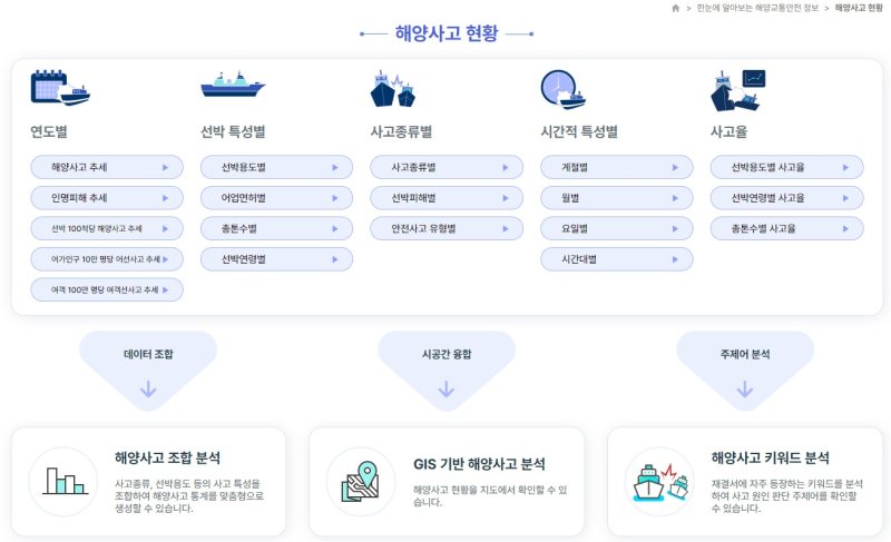 여기에 GIS(지리정보체계) 기반 해양사고 분석을 더해, 해역별 사고현황 통계와 사고별 특성까지 확인할 수 있도록 했다.