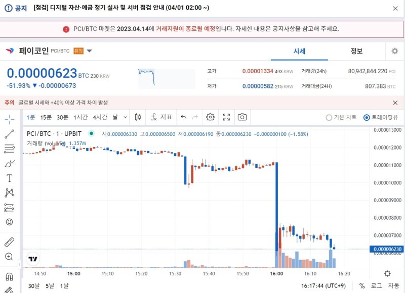 업비트의 이 같은 내용의 공지가 게시되자, 페이코인 가격은 오후 4시 기준, 1분만에 45% 이상 폭락했다.