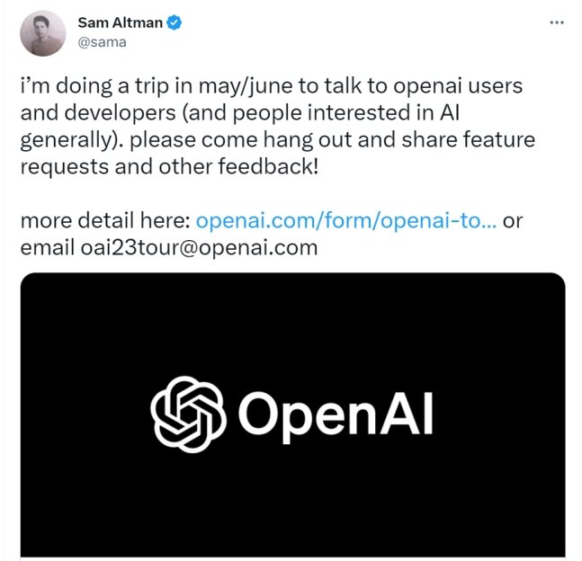 알트만 CEO는 29일(현지시간) 자신의 트위터에 "오는 5, 6월에 오픈AI 이용자나 개발자 등 AI 전반에 관심이 있는 사람들을 만나는 오픈AI 투어 2023을 시작한다"며 "정책 입안자들과 대화할 수 있기를 바란다"고 밝혔다. 서울을 포함한 전 세계 투어 일정은 구체적으로 알려지지 않았다.