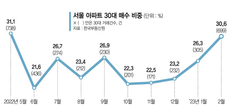 2일 한국부동산원 통계를 분석한 결과 지난 2월 서울 아파트 매매거래에서 30대가 차지하는 비중은 30.6%로 지난해 5월(31.1%) 이후 최고치이다. 전달(26.3%)과 비교하면 한달 새 비중이 4.3%p 상승했다.