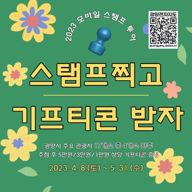 지정 관광지 중 4개소를 선택해 투어하고 4개소 완주인증서를 광양시 문화관광 홈페이지 스탬프 투어 코너에 게시하면 추첨을 통해 총 70명에게 소정의 상품을 증정한다.