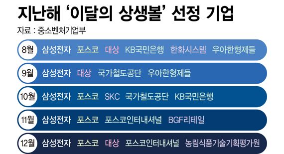 한편, 현재까지 이달의 상생볼 제도를 통해 총 11개사의 24개 상생협력 활동이 우수사례로 선정됐다. '삼성전자'가 총 5번 이달의 상생볼로 선정되며 최다 선정 기업으로 나타났으며 '포스코'와 '대상'이 각각 4번, 3번 선정되면서 그 뒤를 이었다. 상생볼 제도엔 대기업과 공공기관을 비롯한 총 210개의 기업이 참여하고 있다.