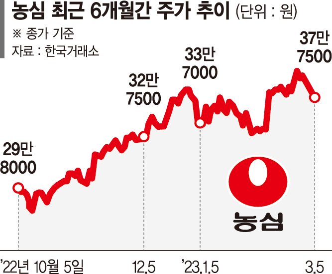 5일 한국거래소에 따르면 농심 주가는 최근 6개월 동안 26.67% 상승했다. 지난해 10월 5일 29만8000원에서 현재는 37만7500원으로 올랐다.