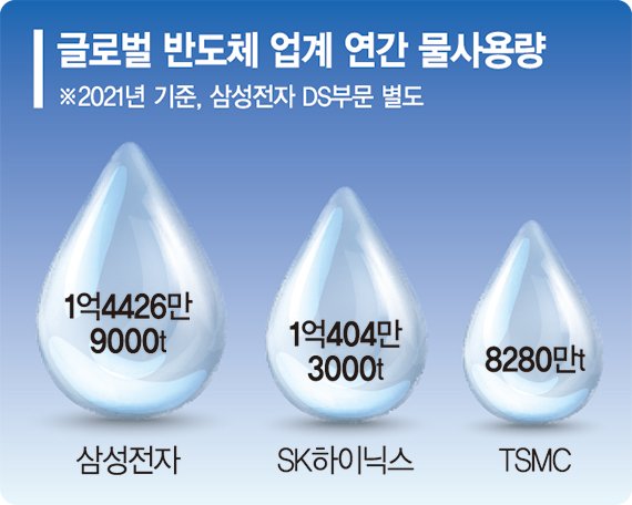 반도체사업장은 물 사용량이 많은 대표적 업종으로 수자원 확보는 업계의 골칫거리다. 공업용수에서 불순물을 제거한 '초순수'는 웨이퍼와 반도체를 씻는 세정이나 웨이퍼를 깎는 식각 공정에 활용되고 있다. 업계 관계자는 "초미세공정으로 갈수록 더 많은 양의 물이 필요하다"면서 "반도체 라인 증설에 따라 2030년이 되면 삼성전자 반도체사업장에 필요한 공업용수가 현재의 두 배 이상이 될 전망"이라고 내다봤다.